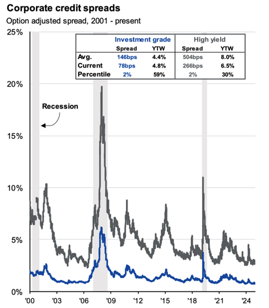 Looking ahead to 2026, some of these tailwinds are likely to dissipate (or at least not recur to the same magnitude). While additional rate cuts are possible, there is no clear consensus among current Fed governors on the need for additional cuts. On the one hand, employment growth is slowing—2025 was the worst year for net job growth (outside of a recession) since 2003. On the other hand, inflation is still running close to 3% and above the Fed’s target of 2%, leaving little room to maneuver. Finally, with credit spreads (the extra yield investors demand to lend to a riskier borrower instead of a safer one) already historically low (Figure 1.5), it is unlikely that they compress further (spreads tend to widen during periods of market volatility or financial dislocation).