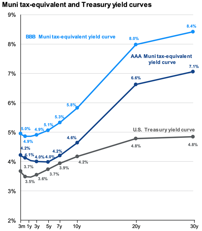One pocket of relative value in the bond market remains municipal bonds. Even as federal debt has ballooned as a % of GDP over the last 15 years, state and local debt has declined as a % of GDP. Moreover, in the wake of the Great Financial Crisis, many state governments boosted their “Rainy Day Fund” reserves, increasing financial flexibility. Tax-equivalent yields on Muni bonds (for taxpayers in the top bracket) continue to be very attractive compared to U.S. Treasury debt, especially for longer maturities (Figure 1.6).