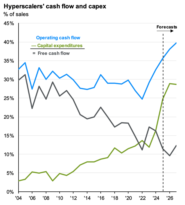 As discussed in our Q3 Commentary, the AI “Hyperscalers” remain among the most profitable companies on the planet. However, they are now diverting a much higher proportion of their operating cash flow into capital expenditures (Figure 1.2), fundamentally changing the capital intensity of their businesses, and (arguably) the risk/reward proposition for investors. Free cash flow (the cash a business has left over after it runs its day‑to‑day operations and pays for big investments like equipment and buildings) as a percentage of sales for this cohort has declined by nearly two-thirds in the last two decades, reducing the amount available for distribution to shareholders via dividends and share repurchases.