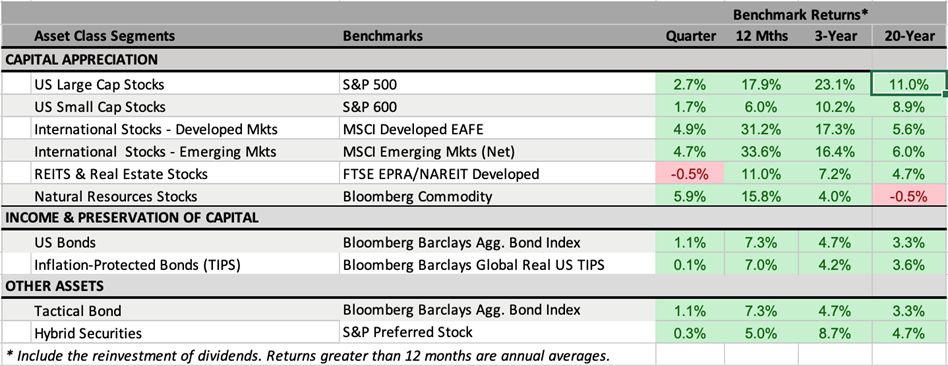 The fourth quarter of 2025 saw markets shrug off sluggish U.S. job growth and a record-long 45-day government shutdown to expand on strongly positive returns for virtually every asset class (Figure 1.1). The Federal Reserve cut interest rates twice in the quarter (and 3 times in the final 4 months of the year), reducing the Fed Funds rate by a cumulative 0.75%. Looser monetary policy, amid strong profit growth and subdued inflation, buoyed stock and bond returns.