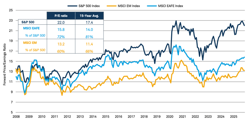 Even without the currency tailwind, international stocks outperformed the S&P 500, with the MSCI All-Cap ex-U.S. Index rising 25.1% in local-currency terms (+33.1% in $USD). Both international developed and emerging market stock valuations remain well below those of the S&P 500 index (Figure 1.4), offering a compelling alternative for investors seeking broader diversification from an increasingly top-heavy U.S. equity market.
